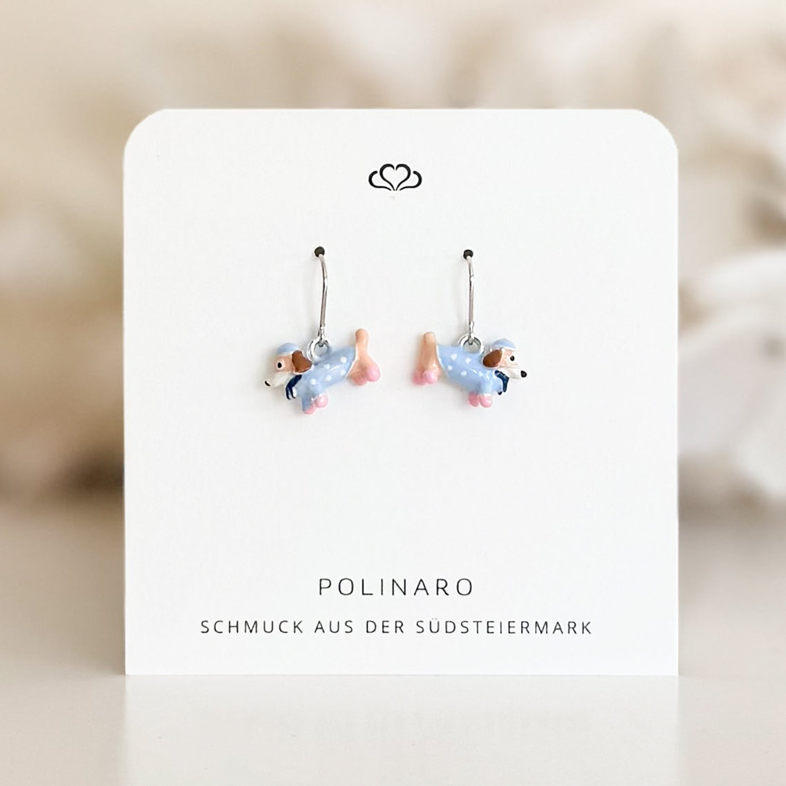 Die Ohrringe bestehen aus 925 Sterlingsilber, rhodinierten Ohrhaken und einem kleinen, entzückenden handbemalten Charmanhänger in Form eines Dackels mit blauer Mütze.