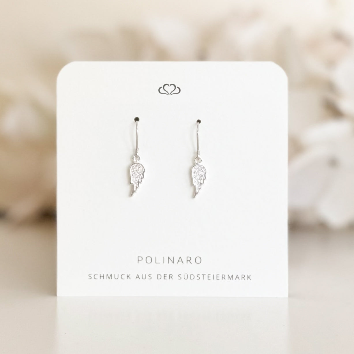 Die Ohrringe bestehen aus 925 Sterlingsilber, rhodinierten Ohrhaken und einem Messing Anhänger in Flügelform mit kleinen Strasssteinchen.