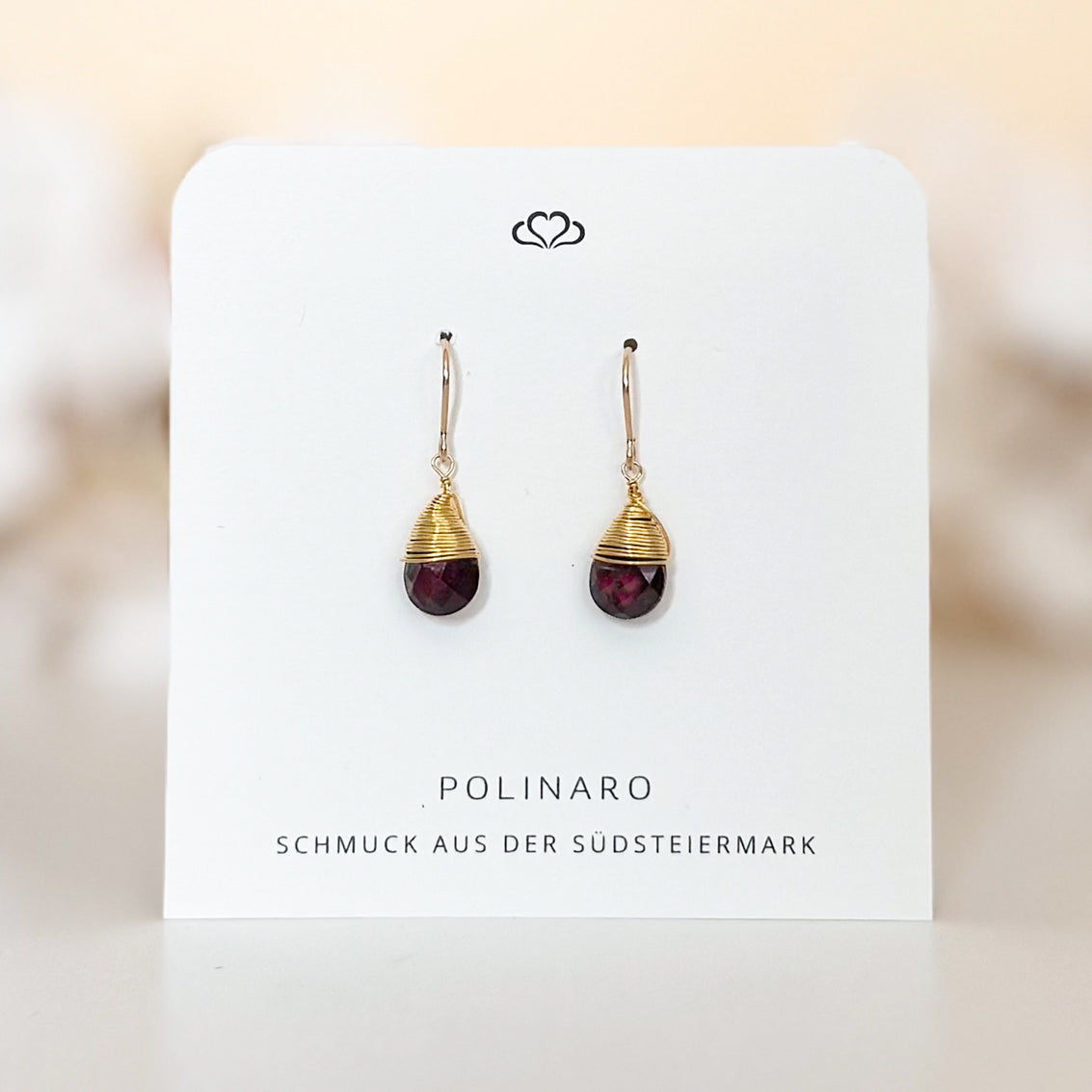 Die Ohrringe bestehen aus einem vergoldet, eingefassten Granat Tropfen und 14 Karat Gold gefüllten Ohrhaken.