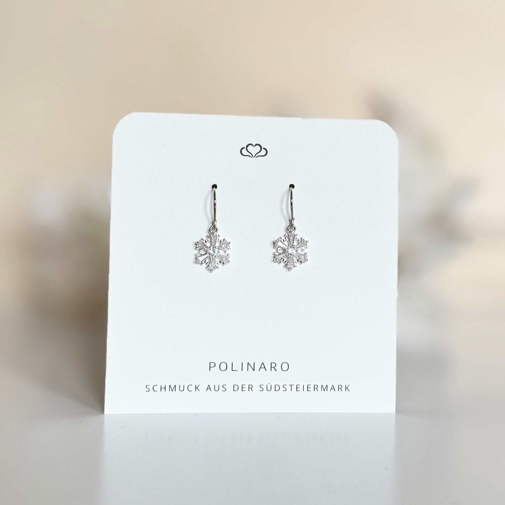 Die Ohrringe bestehen aus 925 Sterlingsilber, rhodinierten Ohrhaken und einem Messing Anhänger in Schneeflockenform.
