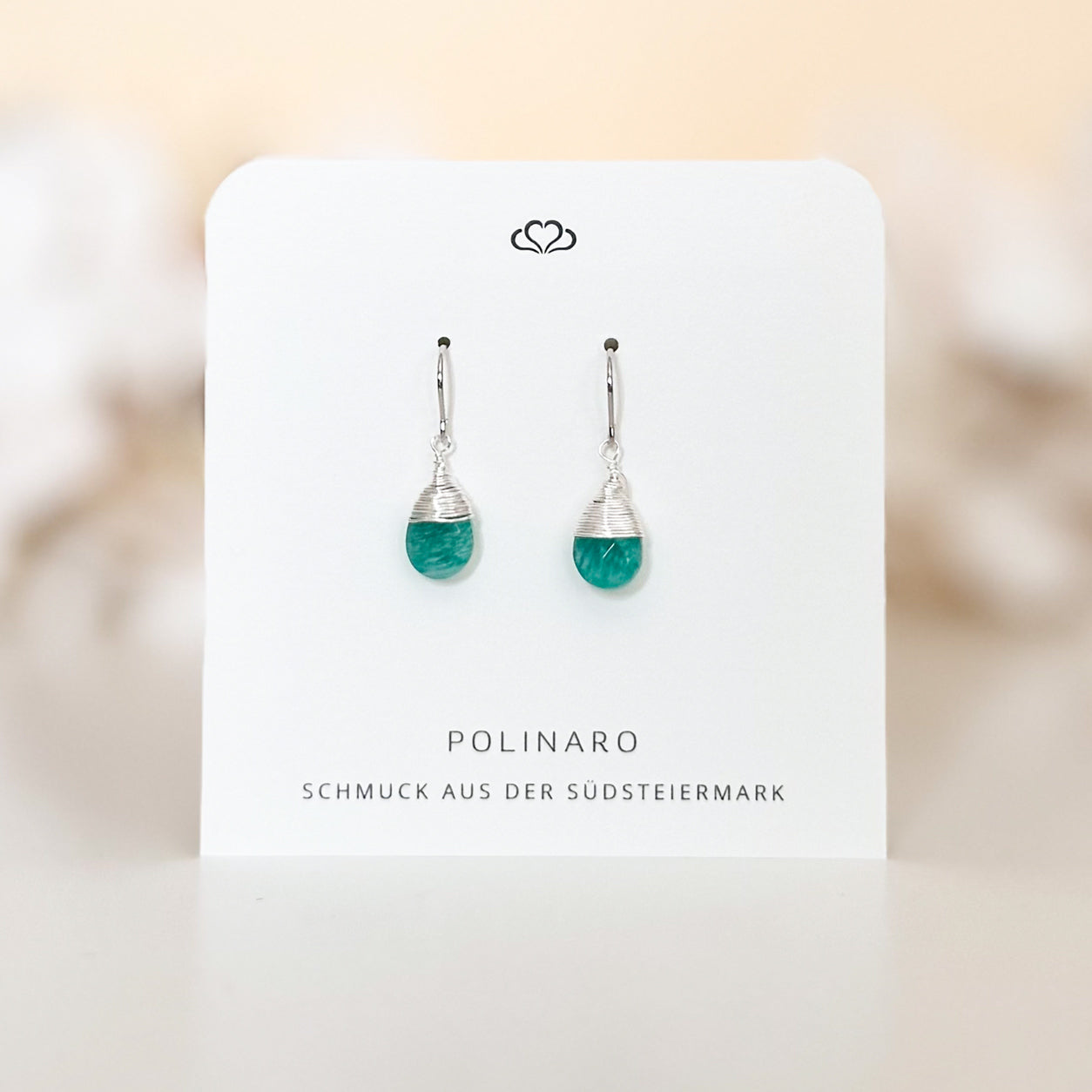 Die Ohrringe bestehen aus einem Sterlingsilberdraht umwickelten Amazonit Anhänger und Ohrhaken aus 925 Sterlingsilber rhodiniert.