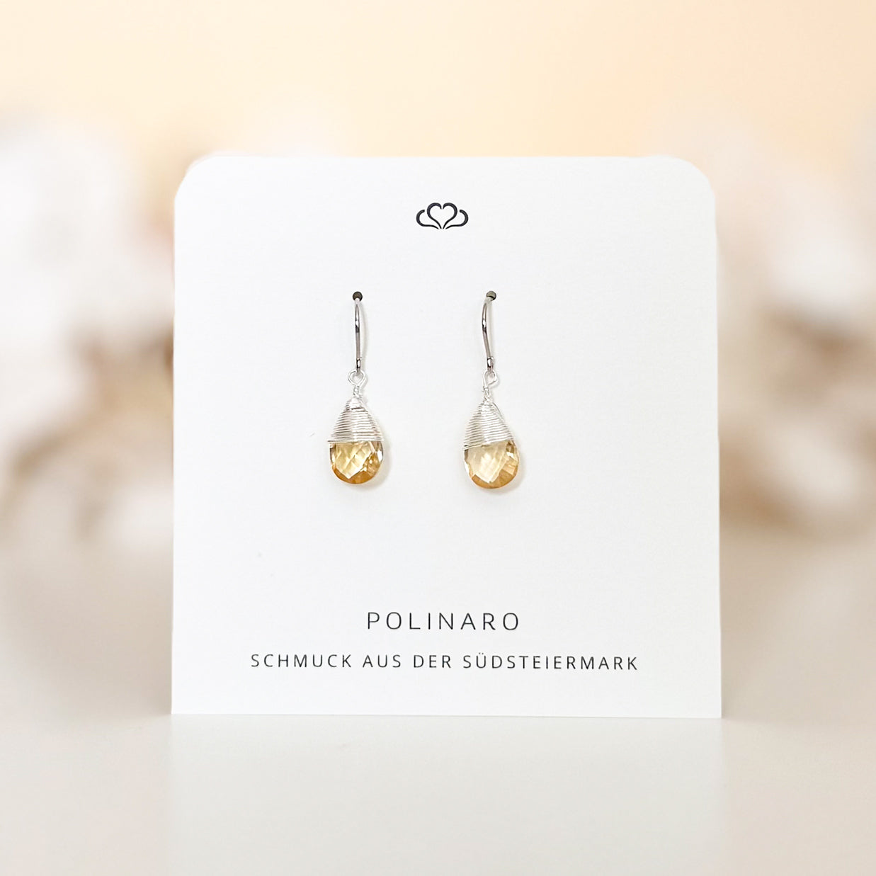 Die Ohrringe bestehen aus einem Sterlingsilberdraht umwickelten Citrin Anhänger und Ohrhaken aus 925 Sterlingsilber rhodiniert.