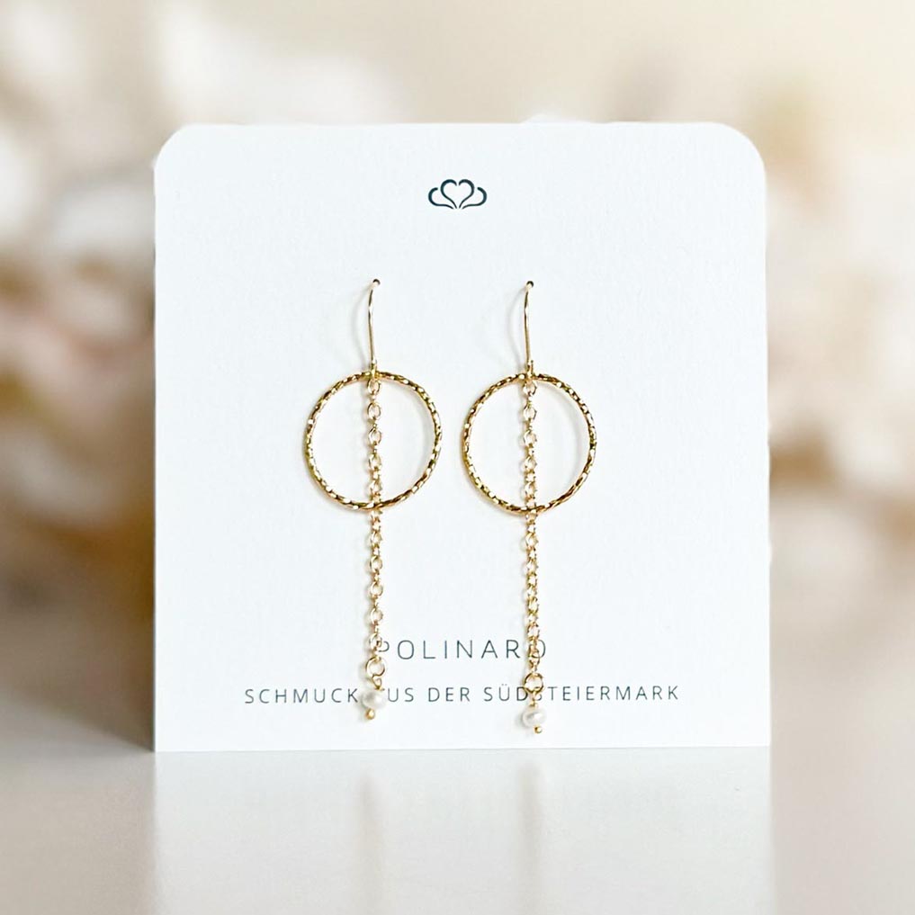 Die Ohrringe bestehen aus Ohrhaken, welche in Gold Filled Qualität langlebig und auch für empfindliche Ohren geeignet sind. Weiters auch einem vergoldeten Anhänger in Kreisform und einer entzückenden Süßwasserperle. Gefertigt werden die Ohrringe von Hand in der Südsteiermark.