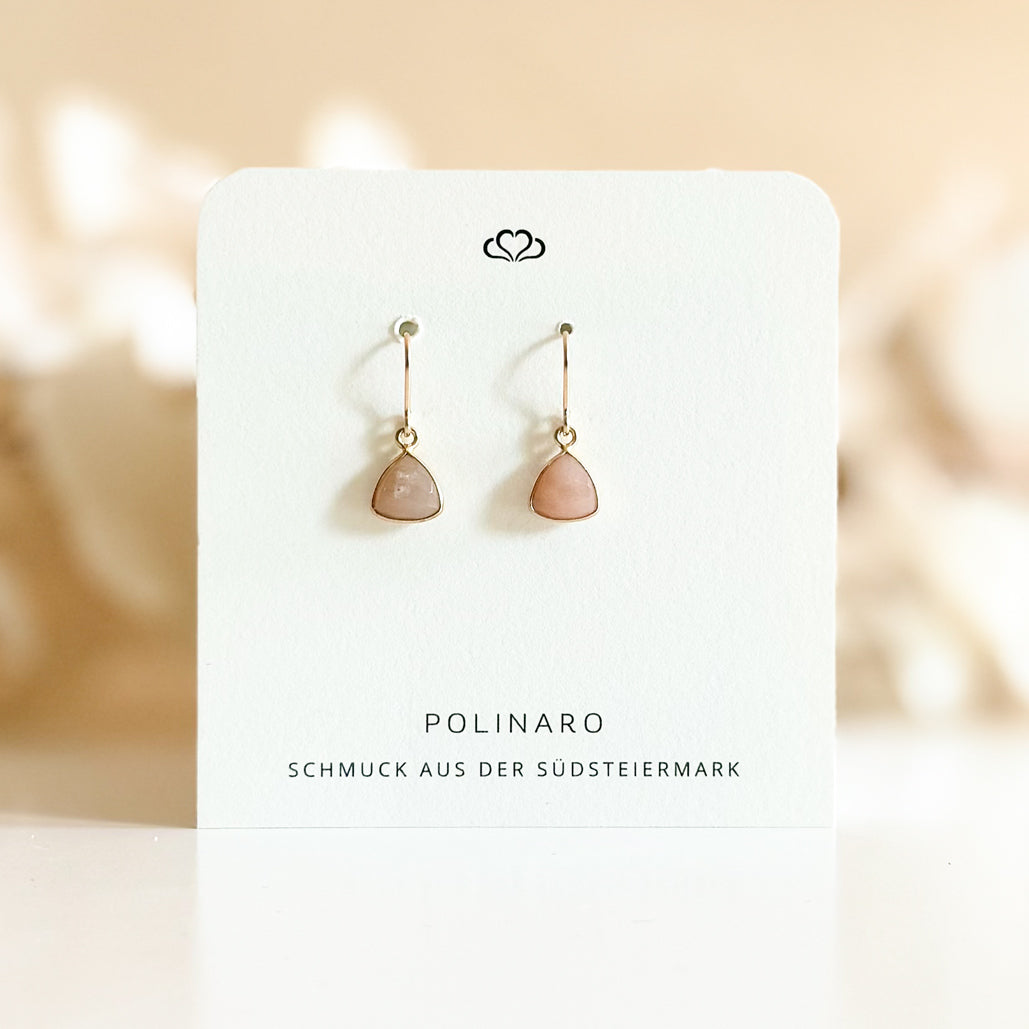 Die Ohrringe bestehen aus Ohrhaken, welche in Gold Filled Qualität langlebig und auch für empfindliche Ohren geeignet sind. Weiters auch aus einem Anhänger, dreiecksförmig mit Sterlingsilber 925 Einfassung.