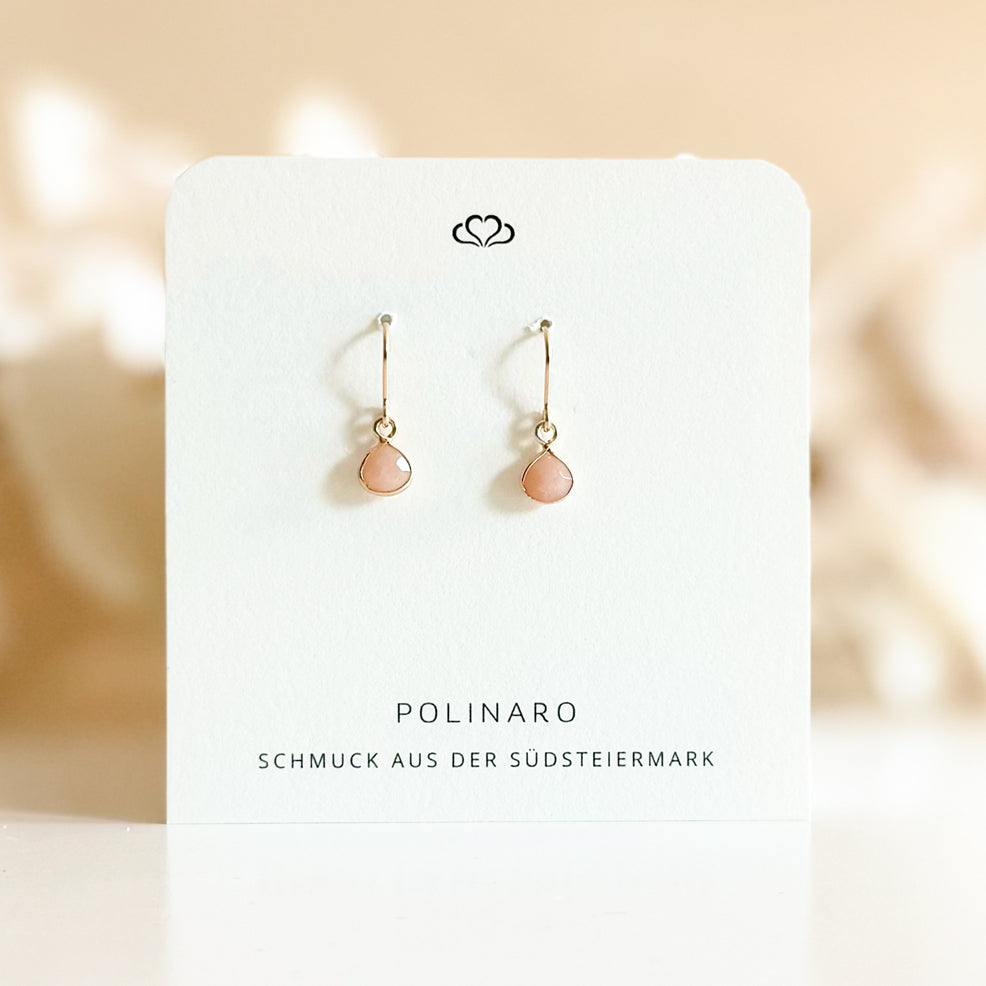 Die Ohrringe bestehen aus 14 Karat Gold Filled Ohrhaken und einem Anhänger, dreiecksförmig, oranger Mondstein mit Sterlingsilber 925 Einfassung.