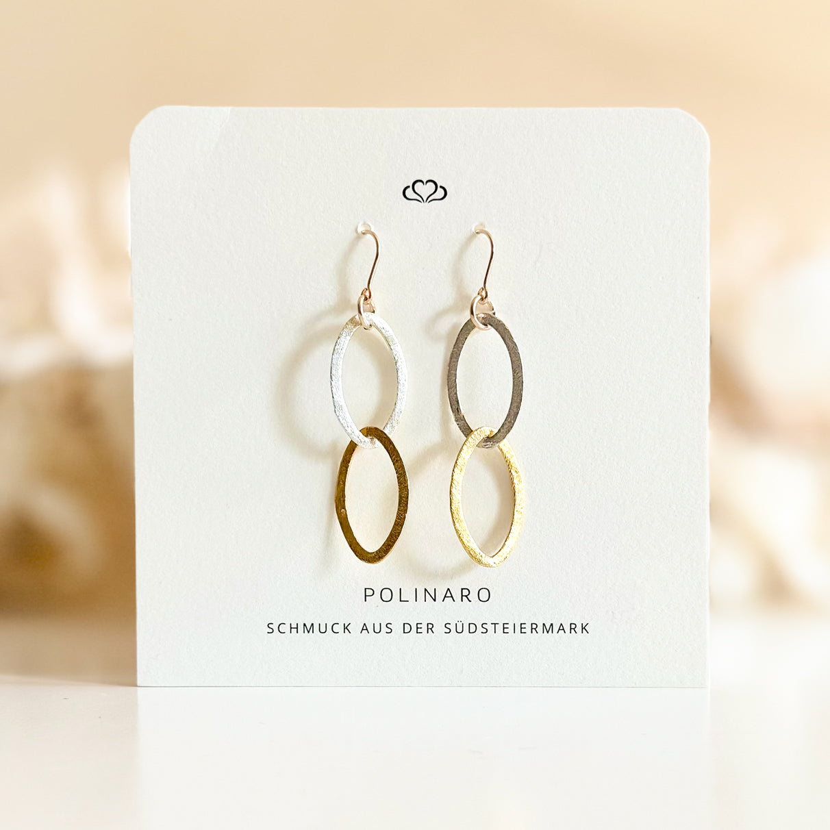 Die Ohrringe bestehen einem silbernen und einem vergoldetem Silberelement und dauerhaft vergoldeten Ohrhaken. Gefertigt werden die Ohrringe in der Südsteiermark.
