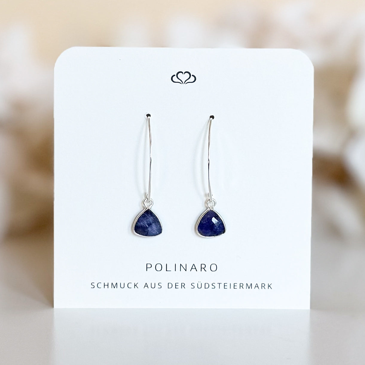 Die Ohrringe bestehen aus einem 925 Sterlingsilber eingefassten, facettierten Stein in Saphirfarbe und 925 Sterlingsilber Ohrhaken.