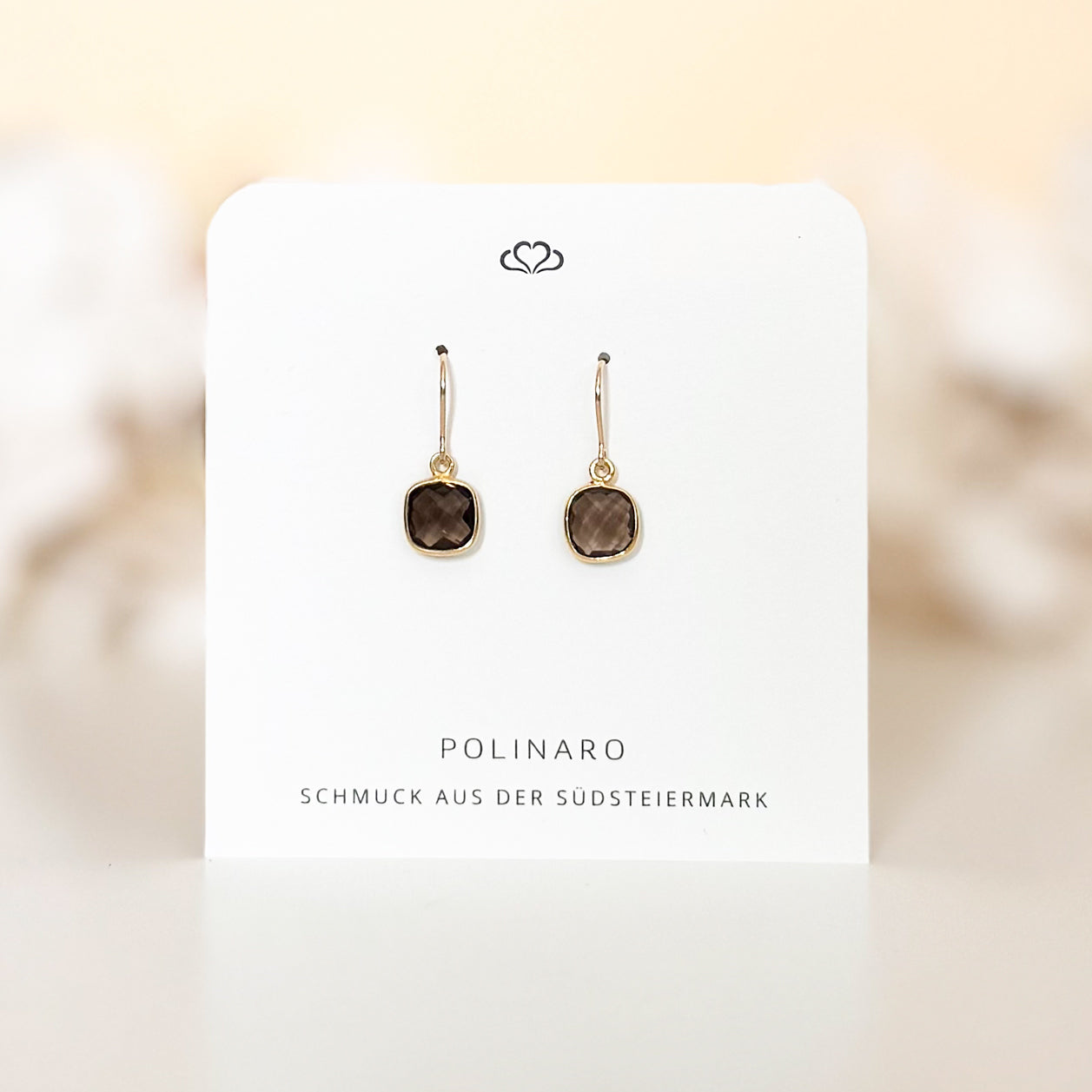 Die Ohrringe bestehen aus einem Anhänger mit facettierten, quadratischen Rauchquarz und 14 Karat Gold Filled Ohrhaken.